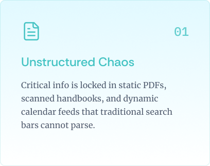 We transform your chaotic sprawl of PDFs, web pages, and calendars into a unified "Answer Engine" that instantly resolves user queries, deflects support tickets, and drives self-service.