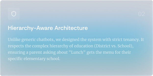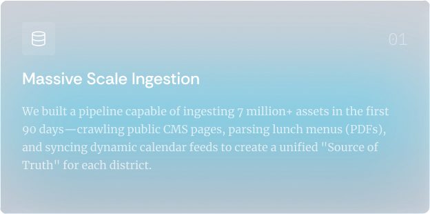 The client serves 43,000+ K-12 education institutions in the USA. Their end-users were flooding support channels with repetitive questions because the existing "keyword search" was broken. The data was there—spread across CMS pages, newsletters, and millions of PDF attachments—but it was inaccessible to the users.