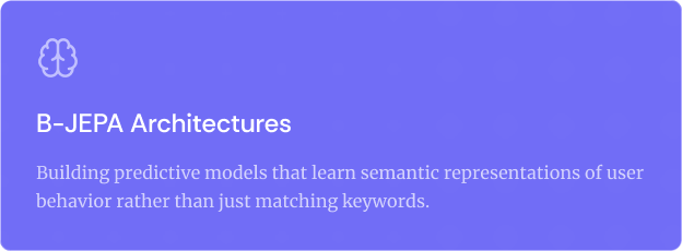 We move beyond static segmentation by building Behavioral Joint Embedding Predictive Architectures (B-JEPA)—AI that simulates, predicts, and orchestrates the future state of the customer journey in real-time.